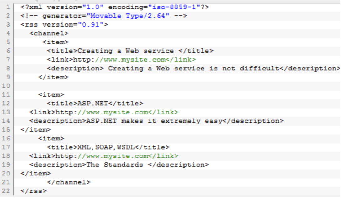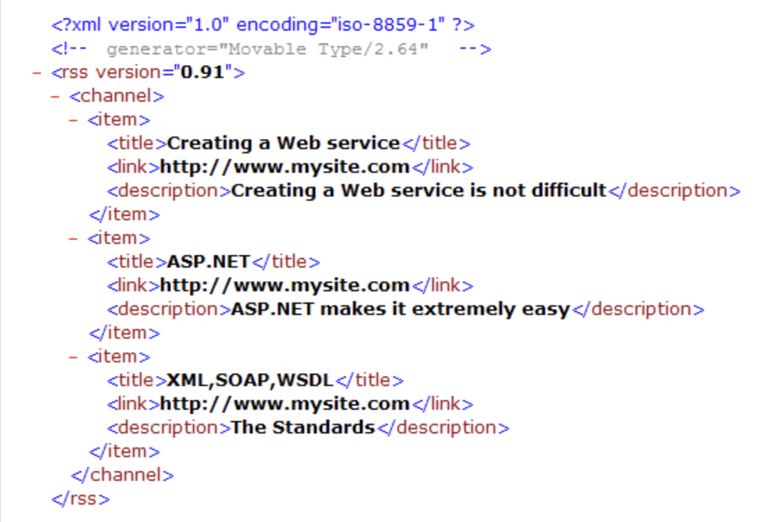 The entire Web service concept is based on XML. Which begs the question, what is XML? XML is an eXtensible Mark-up Language that enables you to identify and organize your information in a more accurate and flexible way. It is called extensible because it does not have a fixed format. An example of a mark-up language that has a fixed format is HTML, which is an SML or Single Markup Language. The difference between the two is that with XML you can define any element and call it whatever you like, while with HTML you already have pre-defined elements and attributes. For instance, to make text appear italic in a Web browser, you use the tags. Every modern browser will know how to display that text. Without pre-defined tags like this, XML allows you to define your own tags to both display and format text. This flexibility is exactly what Web services use to make it both platform and implementation independent. XML is most widely used in RSS documents, which are used for news syndication on the Internet. Below is an example of an XML document: